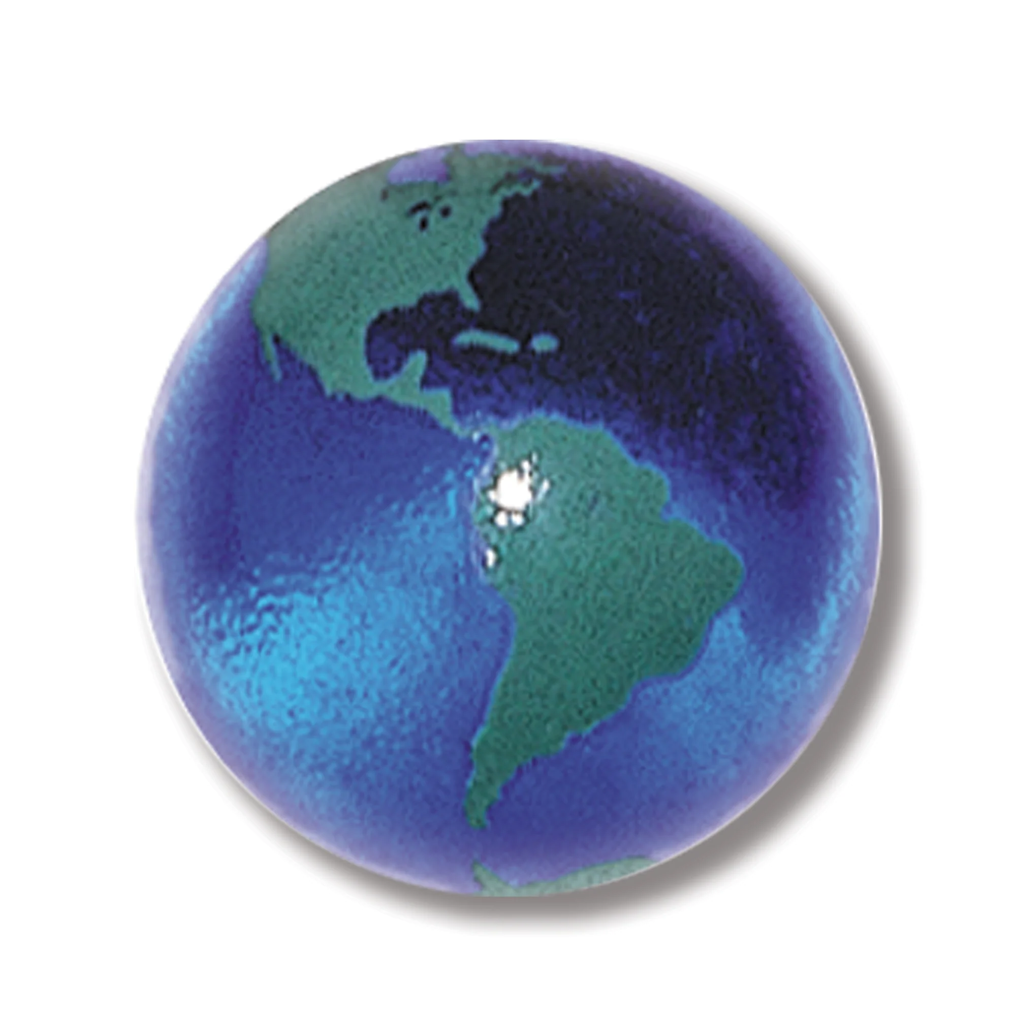 Prachtige Aarde Knikker met blauw-groene opdruk van de continenten. Gerecycled glas. Doorsnede: 2,2 cm. Met metalen standaardje om de knikker neer te zetten.