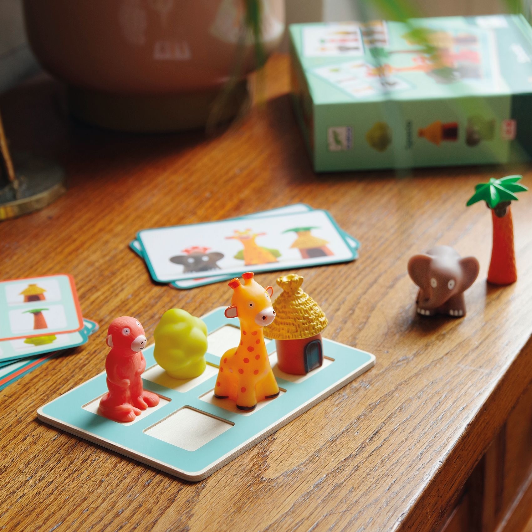 Om het voorbeeld op de foto na te bootsen, moeten de figuurtjes op de juiste plek op het bord worden gezet. Waar is de giraf: voor of achter de olifant? Rechts of links? Het spel is zelfcorrigerend: de oplossingen staan op de achterkant van de kaarten. Het spel heeft twee moeilijkheidsgraden. Een educatief spel uit de serie van Eduludo van Djeco. Met duidelijke uitleg. In 10 talen.